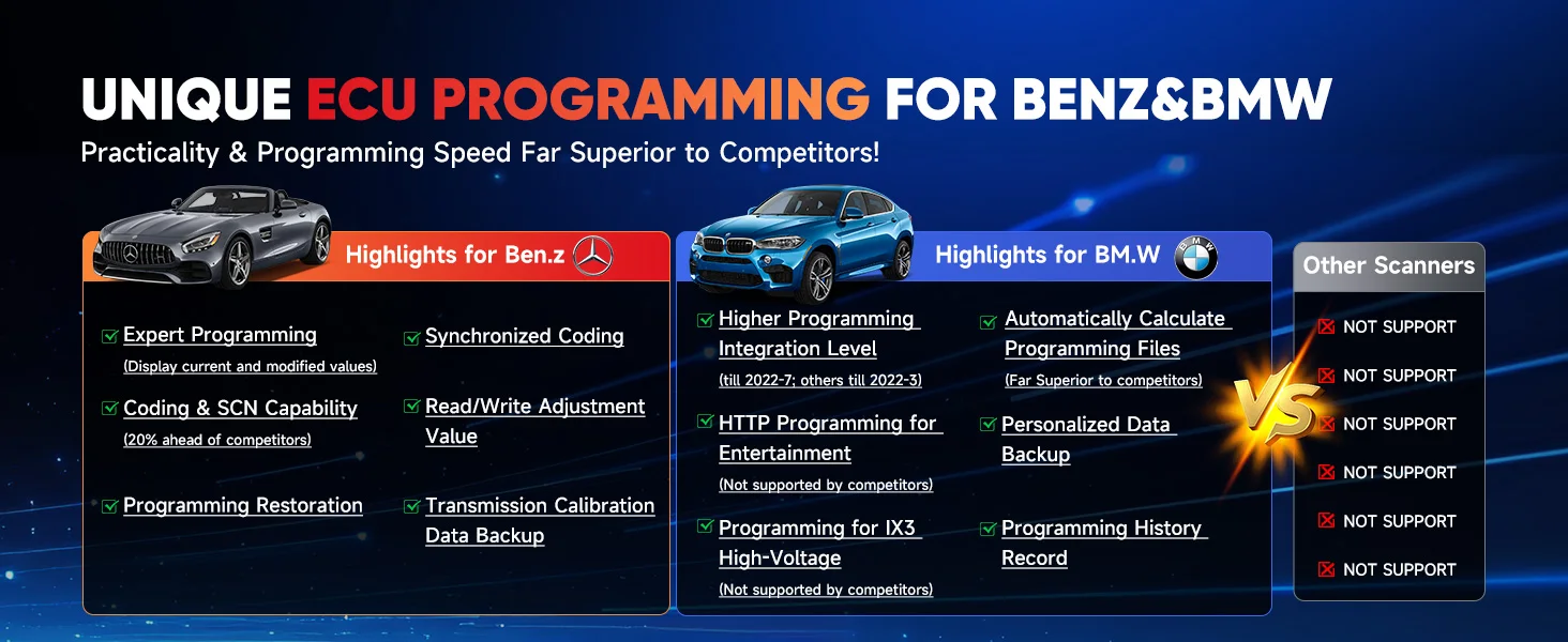 Autel MaxiSys Ultra support ECU programming for replacing the existing software/firmware in the Electronic Control Units (ECU), programming new ECUs and fixing software-controlled drivability issues and emission issues for some B~MW and Benz.