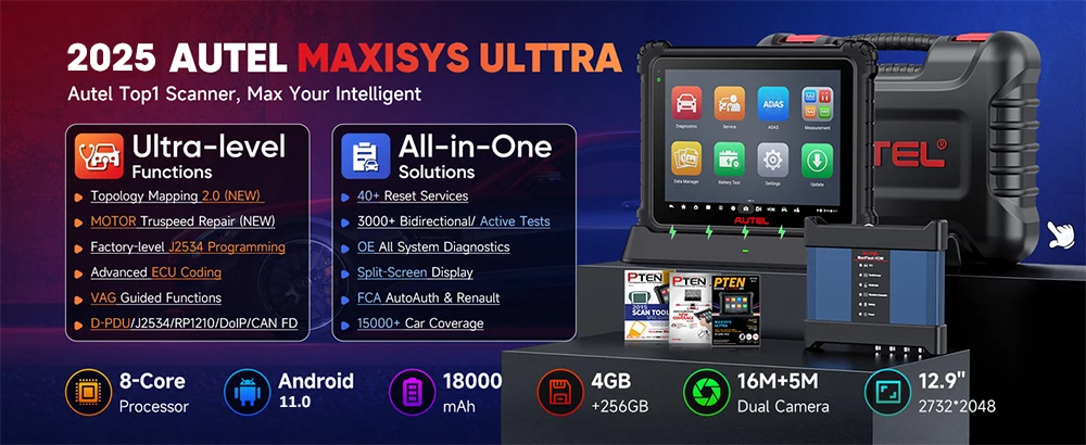 Autel MaxiSys Ultra - Updated Version of MaxiSys Elite II/MS909/MS919/MS908S, ✅Built-in 12.9 inch TFT-LCD✅Android 11.0✅2.3GHz Quad + 1.7GHz Quad, 4GB RAM & 256GB ROM,✅Front & rear cameras✅18000mAh battery✅Wi-Fi & BT Dual Wireless Connection✅Added New Function FCA Auto Auth, Battery Testing etc. MaxiSys Ultra Scanner is the Best Choice for Large Auto Workshops.