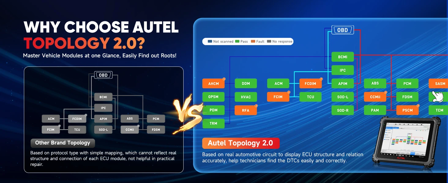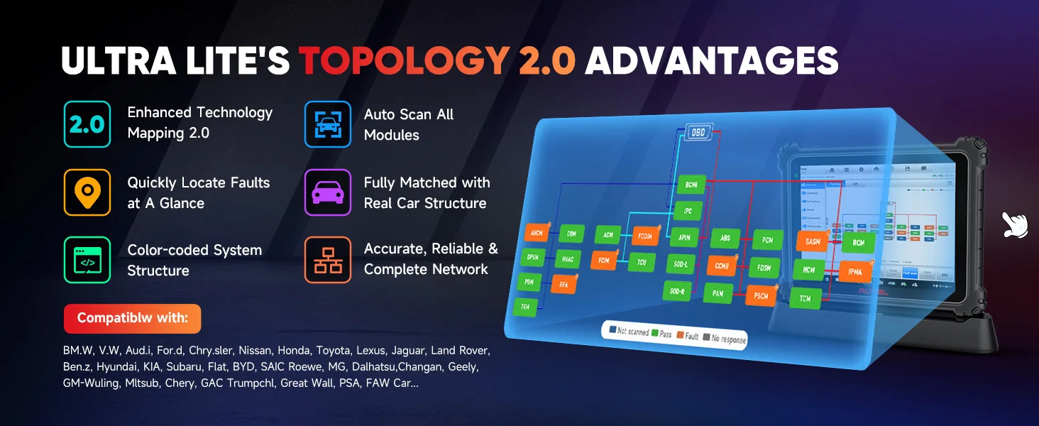 Veiw the problem of vehicle more intuitively, and the One-stop Intelligent Diagnosis ,which based on DTCs, could help you get vehicle status more clearly; the Ultra features the TSB, repair tips, DTC analysis, etc.Ultra performs in-depth analysis and gives the OE data,Make handling suggestions for each fault code. Besides The colorred topology map makes the communication relationship between the systems and the location of all fault codes clear.