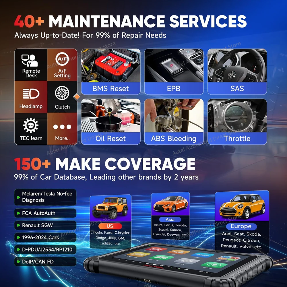 Autel MaxiSys Ultra flagship car diagnostic scanner can perform the most comprehensive 40+ services on the 99% vehicles, including Oil Reset, EPB Reset, SAS Calibration, Airbag Reset, BMS Reset, Brake Bleed, TPMS Reset, DPF Regeneration, IMMO, Clutch, Trans Adaption, WIN DR ROOF, Headlamp, TEC Learn, A/F Setting, Injector Coding, Suspension Calibration, Throttle Adaption, ABS/SRS, Gear Learning, Sunroof Initialization, Seats Calibration, Language Change, Headlight Matching, CHG Tire Size, Cylinder, Turbocharging, Limit, Trans Adaption, VIN, ACC, HV Battery, Transport Mode, A/C, Rain/Light Sensor ... and keep updating for MORE!”