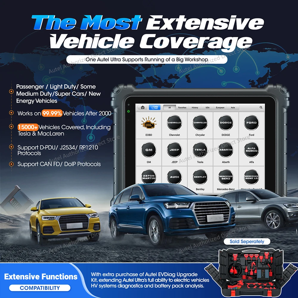 Bi-directional Control Autel Ultra can transmit command to ECUs and perform active tests like Cooling Fan, A/C Clutch On/Off, Compression Test, ABS Motor Pump, Windows/Wipers/ Sunroof/ Doors Test, Personalized etc. Wide compatibility rates, same as MS909/MS919/Ultra. Covering 80+ car brands, 150+ makes, 10000+ models, with simple internet-ready updates accessible to you via WiFi.