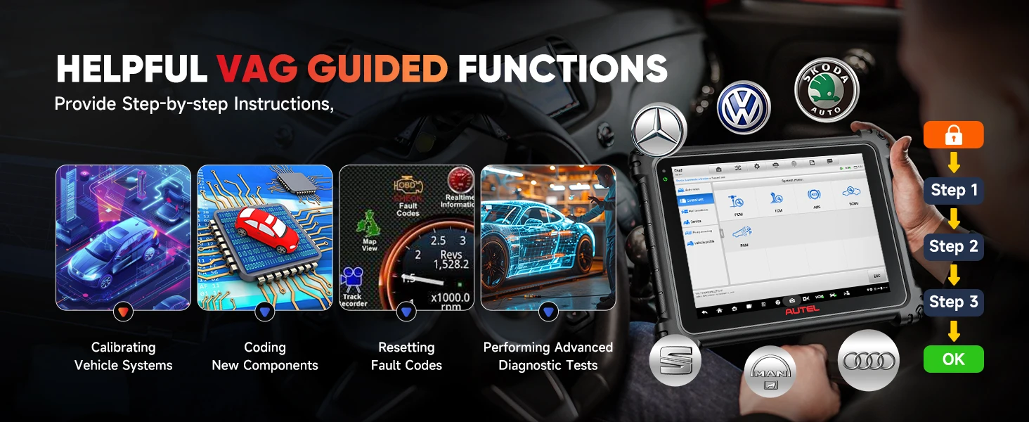 VAG Guided Functions-To skip the Security Access Code & Channel Number to perform matching,calibration, and make basic settings; Provide step-to-step instruction to users, master complicated vehicle diagnostics and services without efforts, compatible with Volkswagen / Audi / Skoda / Seat, etc.